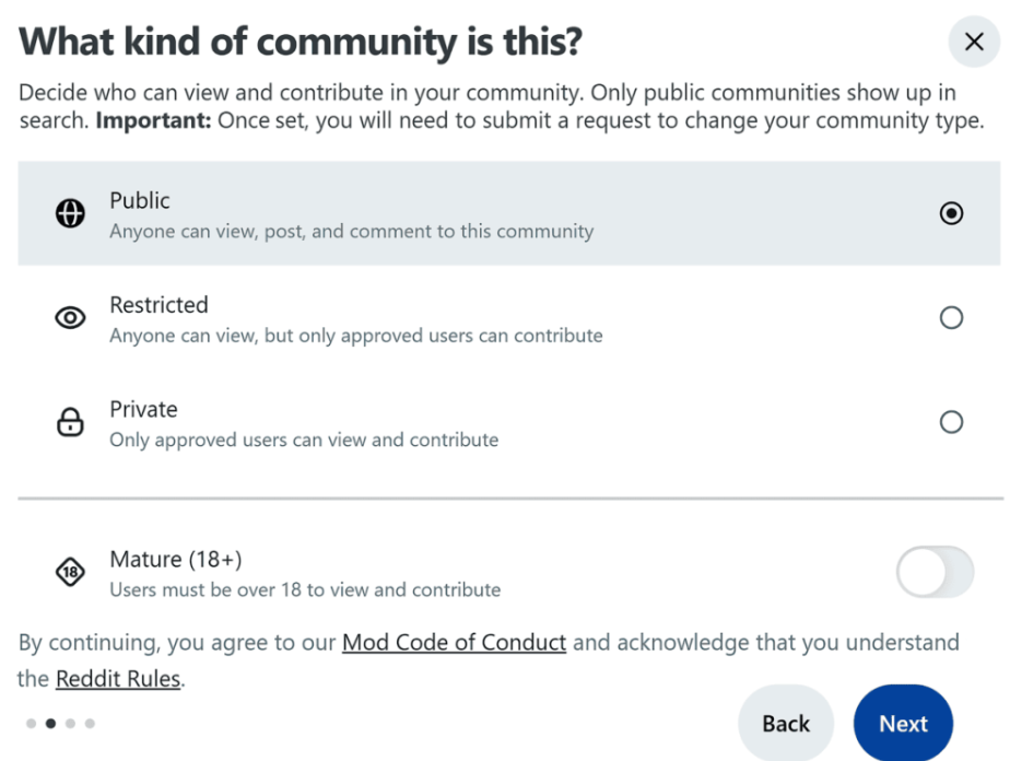 优先选 “公开” 类型,其他类型按需选择且后期切换需 Reddit 批准。