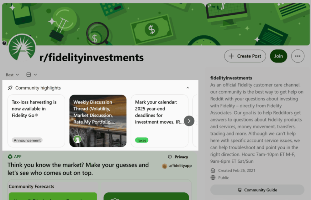 以 r/fidelityinvestments 为例。表面上它是一个官方客户支持社区,但真正支撑其活跃度的,并不是品牌输出,而是: